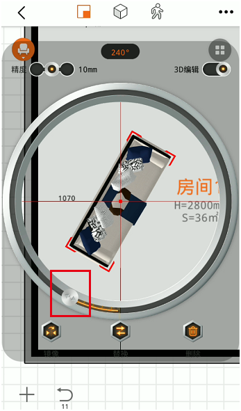 方法二:在无障碍选择栏中,单击选中栏目中的家具,点击右上角精细化操作按钮,进入精细化调整界面,拖动罗盘上的旋转按钮,可以精细调整家具角度,每旋转15度自动识别校准